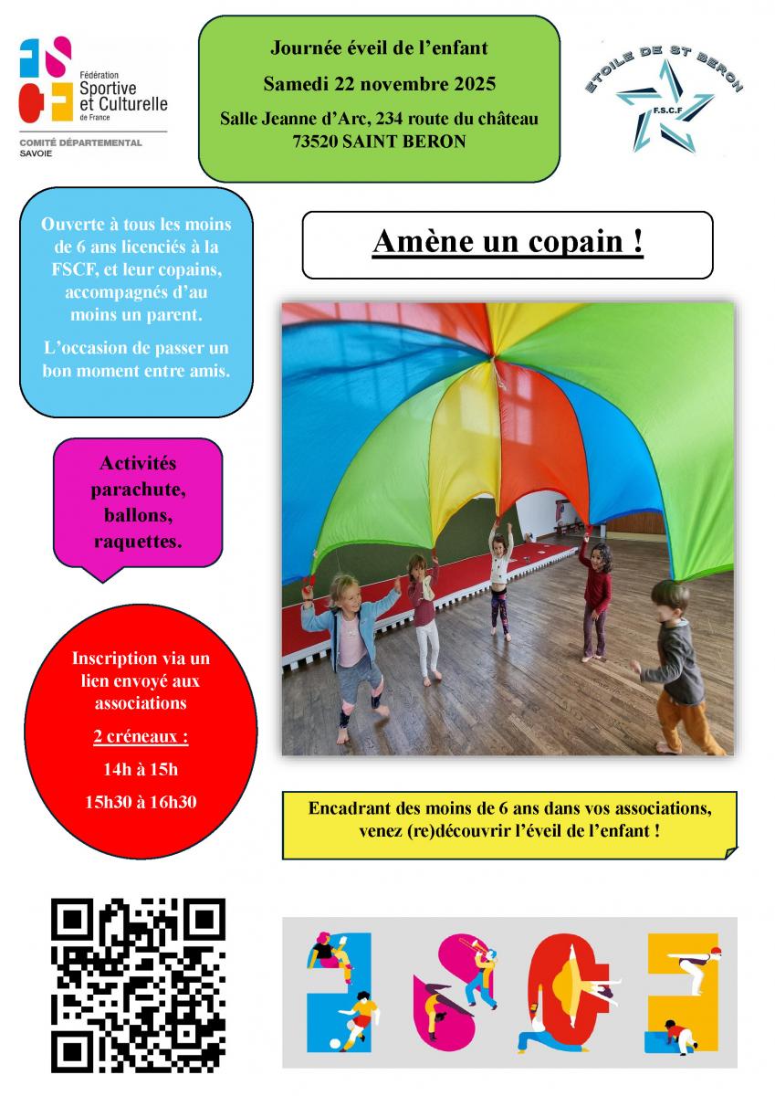 Pour cette deuxième édition, le comité départemental, avec la collaboration précieuse de l'Étoile de Saint-Béron organise un après-midi Éveil de l'enfant "Amène un copain", à destination des moins de 6 ans, licencié·es ou non !