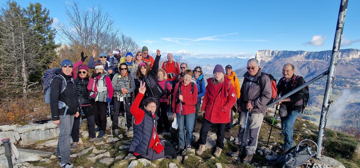 14 joyeux randonneurs de Rando Plus auxquels se sont ajoutés 7 joyeux randonneurs de Nature Rand’Eau Haut Oh ! se sont donnés rendez-vous au Col de la Cluse pour une belle balade animée par Bernard. Alternant forêt et passages découverts, le chemin emprunté nous a conduit au Col du Mollard, puis au col du Planet. De grandes clairières ensoleillées s’offrent à nos yeux. Nous avons eu droit à un petit ravitaillement prévu pour les participants du trail de Montagnole. Un délicieux thé bien chaud, de la brioche, du chocolat, des pâtes de fruits et du pain d’épices offerts par une chouette équipe de bénévoles. Après cet encas aussi inattendu qu’agréable, nous sommes repartis pour gravir quelques mètres de dénivelé qui nous séparent du Col du Grapillon. Puis, bien installés au soleil, la pause pique-nique nous permet de reprendre des forces pour repartir à l’assaut de la dernière montée à travers une jolie forêt jusqu’au belvédère de la pointe de la Cochette. Un panorama grandiose nous y attend, Grand Som, Petit Som, Le Pinet, le Mont Granier et la vallée des Entremonts. Nous ne verrons pas le Mont Blanc, quelques nuages ont décidé de le cacher. Les Bauges sont englouties sous une épaisse mer de nuages, ce qui laisse présager qu’en-bas ils n’auront pas vu le soleil de la journée.